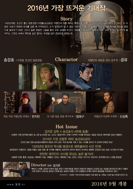 영화『밀정』은 1920년대 말, 일제의 주요 시설을 파괴하기 위해 상해에서 경성으로 폭탄을 들여오려는 의열단과 이를 쫓는 일본 경찰 사이의 숨막히는 암투와 회유, 교란작전을 그린 영화이다. 배우 송강호뿐만아니라 공유, 한지민, 엄태구, 신성록 등 배우가 각자가 지닌 개성을 아낌없이 발휘하여 배우로서의 진가를 드러내는 한편, 이병헌과 박희순의 특별출연으로 화제를 불러모아 750만 관객을 동원한 흥행작품이다.