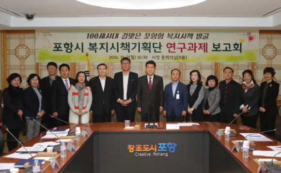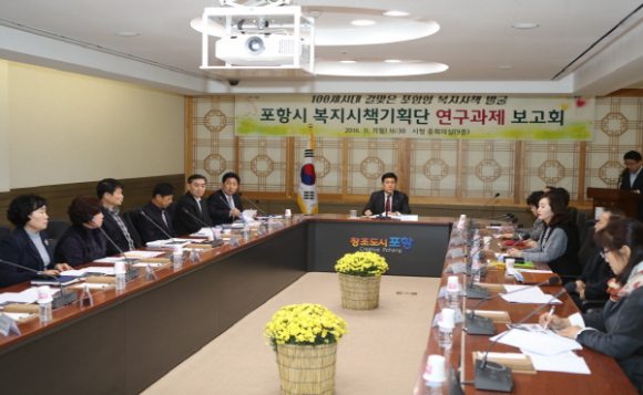 포항시는 지난 7일 시청 중회의실에서 포항시 복지시책기획단 5개팀 민‧관위원 등 30여명이 참석한 가운데 그동안 연구한 복지시책 보고회를 가졌다. 포항시 복지시책기획단은 복지지원팀, 출산‧보육팀, 아동‧청소년팀, 일자리창출팀, 노인‧장애인팀 등 총 34명 5개팀으로 나눠져 100세 시대를 준비하는 ‘생애주기별 포항형 신규복지시책’ 발굴을 위해 지난 4월 발대식을 갖고 활동을 시작했다.
