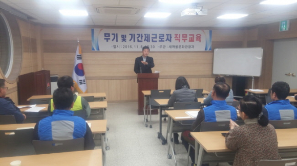 김천시(시장 박보생)는 11월 8일 황악예술체험촌에서 새마을문화관광과에서 관리하는 시설 근무자들을 대상으로 직무교육을 실시했다.