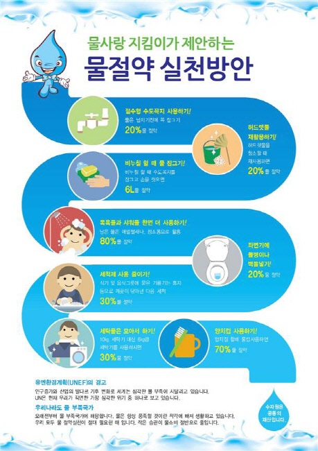 이번 홍보물에는 “물 절약 실천”에 대해 다양한 방법으로 알기 쉽게 표현해 시민들이 수돗물 절약에 적극 동참할 수 있도록 안내하고 있다. 동절기(12월 20일경-2월 말까지)에는 상수도 급수공사를 할 수 없으므로 수돗물 공급이 필요한 경우에는 올해 11월 말까지 상하수도과(840-5734)에 급수공사를 신청해 수돗물 사용에 차질이 발생되지 않도록 주의를 당부했다. ※ 계량기 동파신고 : ☎ 840-5712, 5725~27 ※ 수도관 누수 및 파열신고 : ☎ 840-5714, 5731~37 |