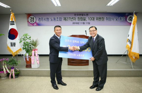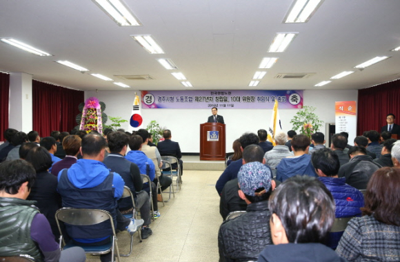 1989년 11월 11일 창립 이후 27년차를 맞은 경주시청노동조합은 환경미화원, 도로보수원, 준설원, 기타 공무직 260여명으로 구성되어 있으며, 제10대 위원장에는 윤석주(53세, 환경미화원) 위원장이 지난 8․9대 위원장에 이어 3선으로 취임했다.