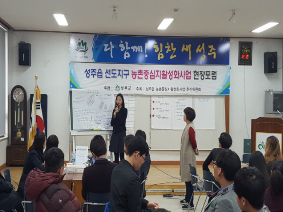 성주군은 2016. 11. 14(월) 2016년 일반농산어촌개발 신규사업으로 추진 중인 성주읍 농촌중심지활성화사업 7차 농촌현장포럼을 성주읍사무소 2층 회의실에서 개최했다. 성주읍 농촌중심지활성화사업은 추진위원회와 PM단을 중심으로 2016년 7월 1차 포럼을 시작으로 선진지 견학을 포함한 6차에 걸쳐 포럼을 실시하였으며, 특히 금번 7차 현장포럼은 성주읍에 살고있는 학생들과 교육관계자 등의 의견을 수렴코자 성주읍 학생 18명(성주초 3명, 중앙초 3명, 성주중 3명, 성주여중 3명, 성주고 3명, 성주여고 3명), 학부모 6명, 학교별 교사 6명을 대상으로 정했다.