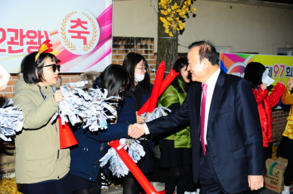 수능시험장 앞에서 “다 아는 문제다! 콕콕 찍어 만점으로 대학 합격” , “이게 정답이다!”, “우리가 원하는 건 수능대박”, “손길 가는 길마다 정답이 있길∼” 등다양하고 익살스러운 문구를 새겨 넣은 피켓과 현수막을 들고 응원하는 출신학교 후배들의 열정 가득한 응원과 함성은 수험생과 학부모들의 긴장된 마음에 따뜻한 위안을 안겨주었으며,