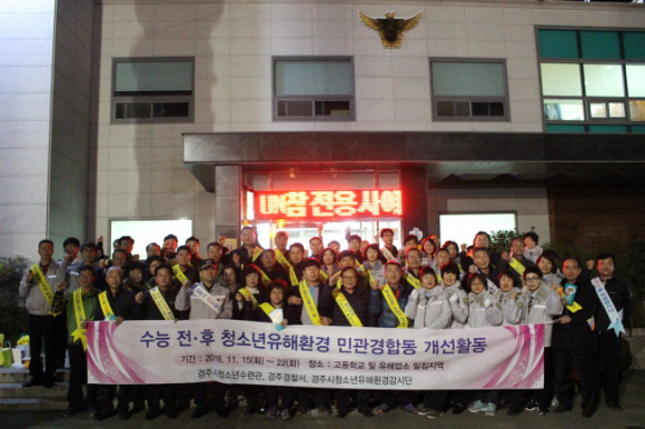 경주경찰서(서장 정흥남)은 2016. 11. 21.(월), 수능시험 후 들뜬 분위기에 도취되어 자칫 증가될 수 있는 청소년 비행에 대응하기 위해 경주시 안강읍내 일원에서 학교전담경찰관, B.B.S 경주지부, 안강생활안전협의회, 자율방범대, 청소년선도위원회 등 협력단체 위원 60여명이 참석한 가운데 유해환경 계도·단속 및 선도를 위한 합동캠페인을 실시했다.