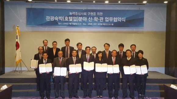 동국대학교 경주캠퍼스는 지난 22일 오후 3시반 서울 쉐라톤 그랜드 워커힐 코스모스홀에서 교육부, 문화체육관광부, 고용노동부 등 정부기관과 호텔업계, 교육훈련계 등 산․학․관 26개 기관과 능력중심사회 구현을 위한 업무협약을 체결했다.