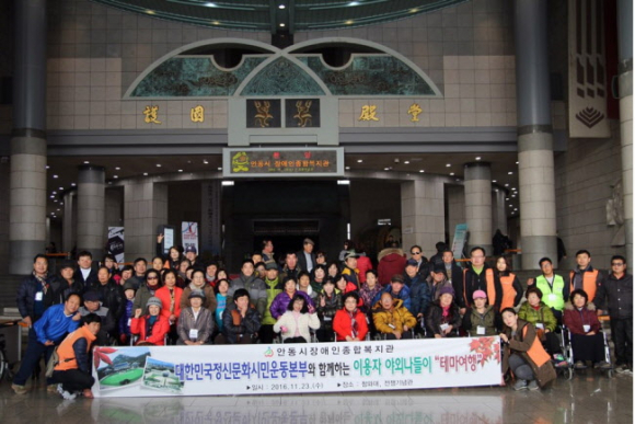 평소 장애로 인하여 야외활동의 기회가 적은 장애인분들을 위해 지역자원과 연계하여 테마여행을 통해 여행의 기회를 제공하고 사회적응력 향상과 경제적 환경적 어려움으로 문화체험의 기회를 가져보지 못한 장애인에게 스트레스를 해소하고 새로운 환경과 다양한 체험을 제공하여 일상생활의 활력소를 향상시키고자 실시된 이용자 야외 나들이 “테마여행” 이번 행사에는 대한민국정신문화시민운동본부(회장 조주옥)와 안동시장애인종합복지관 공동으로 주최 주관하여 실시하였다.