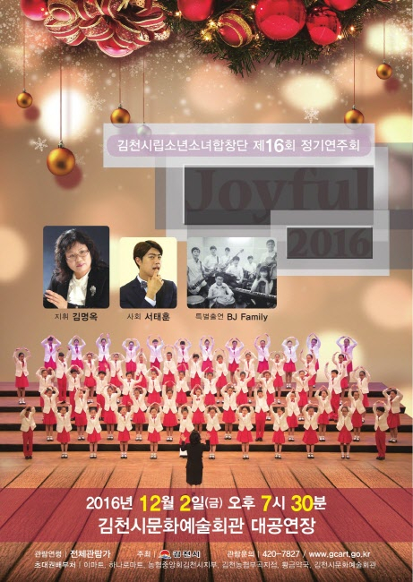 김천시문화예술회관(관장 장귀희)에서는 12월 2일(금) 오후 7시 30분에 대공연장에서 시립소년소녀합창단 제16회 정기연주회를 개최한다. 이번 공연은 ‘Joyful 2016년’라는 부제 아래 다사다난했던 올 한해를 보내며 즐거웠던 일, 행복했던 순간을 신나는 캐럴송과 함께 추억하고자 한다.