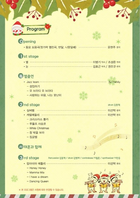 첫 무대에서는 소년소녀합창단이 청량한 목소리로 동요 모음곡 등을 들려주고 이어서 특별무대로 참신한 기획력과 뛰어난 연주 실력으로 최근 많은 러브콜을 받고 있는 재즈팀인『B.J. family』가 자유롭고 멋스러운 공연을 보여준다. 다음은 소년소녀합창단에서 귀여운 율동이 어우러진 캐럴메들리를 들려주고 두 번째 특별무대로 『서태훈과 함께하는 신나는 레크레이션』이 진행된다. 개그맨 서태훈은 KBS 26기 공채 개그맨으로 현재 개그콘스트에서 최고의 인기를 누리고 있다. 마지막 무대에서는 맘마미아의 흥겨운 메들리로 공연을 마무리하게 된다.