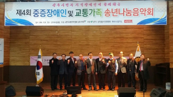 기념식에서는 중증장애인의 일상생활에 든든한 후원자인 상주시 새마을교통봉사대와 후원해주신 분들에게 감사패를 전달하였으며, 특별히 연말을 맞아 소외되고 제한된 공간에서 생활해 온 저소득층 중증장애인들에게 희망과 용기를 주기 위해 ‘나눔음악회’로 친목을 다지는 뜻깊은 시간을 가졌다 |  | | | ⓒ GBN 경북방송 | |