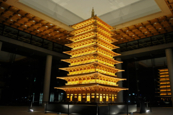 1층 전시실에는 당시 높이가 무려 82m에 달했던 황룡사 9층 목탑의 내‧외부를 섬세하게 표현한 10분의1 크기의 모형탑이 있고, 목탑기둥과 추녀 등 일부를 1:1 비율로 재현해 놓은 조형물은 당시 목탑의 위용을 짐작하게 한다.