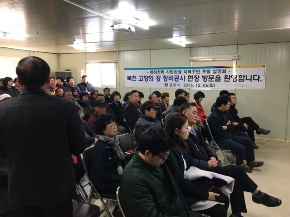 경주시는 6일 민선6기 역점사업으로 시행하고 있는 도심 하천인 ‘북천 고향의 강 정비사업’과 ‘생태하천 복원사업’의 소개와 진행과정 등 현장에서 지역 주민 및 환경단체 100여명을 초빙하여 주민 설명회를 가졌다.