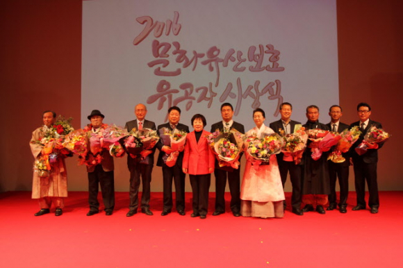 문화재청(청장: 나선화)은 문화유산의 보존▪연구▪활용에 공헌한 단체와 개인 유공자를 발굴하여 12월 8일(목) 나선화청장을 비롯한 수상단체, 개인 및 300여명이 참가한 가운데 한국문화재재단 민속극장 ‘풍류’에서 2016년도 문화유산보호 유공자 시상식을 개최했다.