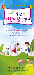 |  | | | ⓒ GBN 경북방송 | △김천, KT&G잔디구장에서 오전 10시부터 김천시가 주최하고 김천시여성단체에서 주관한다. 삐에로슬라이드, 돌고래슬라이드 등 신나는 에어바운스 7종을 운영하여 어린이들이 마음껏 뛰어놀고 즐길 수 있는 공간을 마련하였으며 관내 어린이들의 꿈나무 장구공연, 무술, XPL 태권도 시범 등과 김천시립소년소녀합창단의 ‘어린이 날 노래’ 합창 등의 순으로 진행된다.