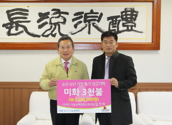 미 동부예천향우회에서는 해마다 소년․소녀가장을 돕는 곳에 쓰이길 바라는 향우회원 모두의 마음을 모아 기금을 마련해 성금을 기탁하고 있으며 이번 전달은 이시화 수석부회장이 고향 방문길에 예천군을 직접 방문해 전달하게 됐다.