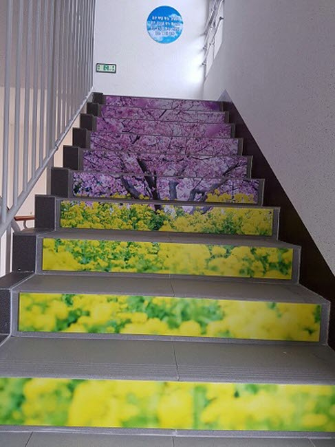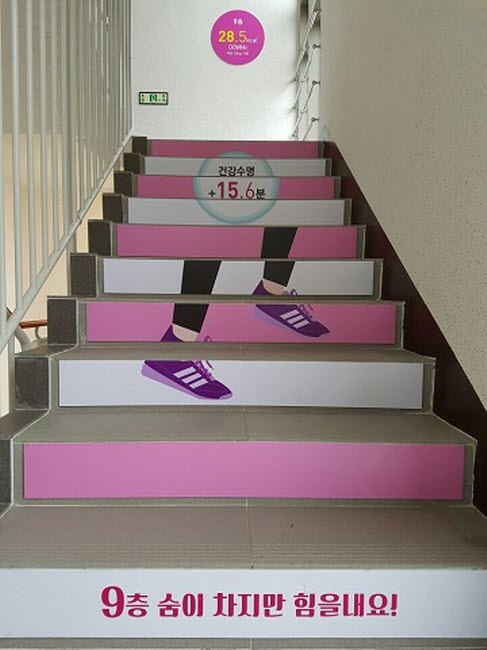 건강계단은 승강기를 이용하는 아파트에서 계단 오르기에 따른칼로리 소모량 및 건강수명을 안내하고 걷고 싶은 예쁜 계단으로걷기운동을 하도록 동기를 부여하고 실천을 유도하고 있다.