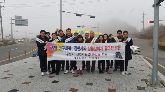 김천시 아포읍(읍장 김병진)과 이장협의회(회장 박희병)는 지난 20일 김천시와 구미시 인근 유동인구가 많은 주요도로변인 송천삼거리에서 출근하는 시민들을 대상으로 김천시 15만 인구회복을 위한 전입홍보 캠페인을 실시했다.