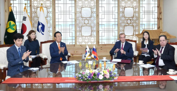 2017년, 러시아 연해주․이란 이스파한주와도 교류협력 추진 신도청 개청식, 자매우호도시 대표단 및 주한 외교사절 참석 조코 위도도 인도네시아 대통령 면담 등 해외 인적 네트워크 확장 중국 후난성과 우호교류협정 체결, 러시아 이르쿠츠크와 자매결연 20주년