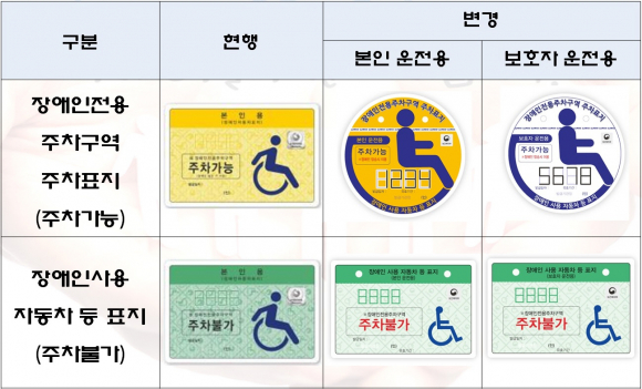 새롭게 바뀌는 표지는 기존 사각모양에서 휠체어를 형상화 한 동그라미 모양으로 바뀌며, 바탕색이 장애인 본인이 운전하면 노란색, 보호자가 운전하면 흰색으로 구분된다.