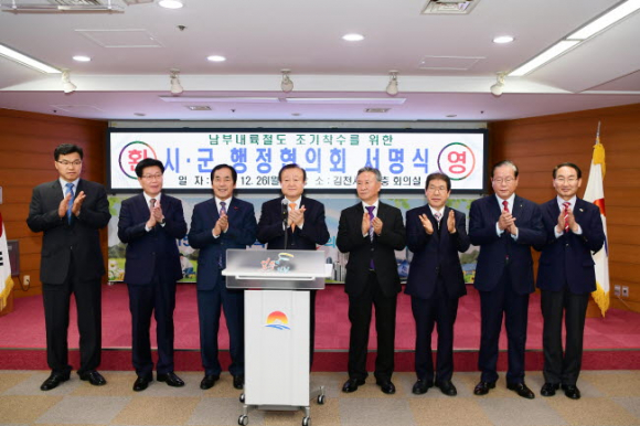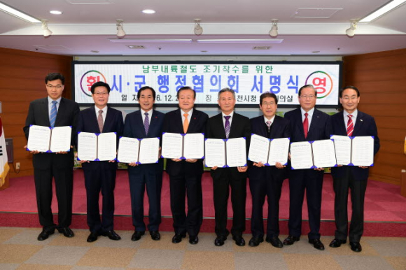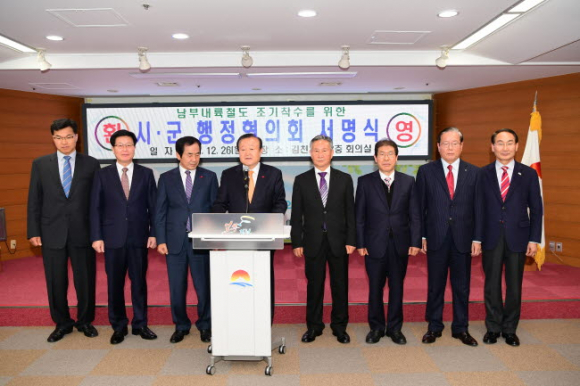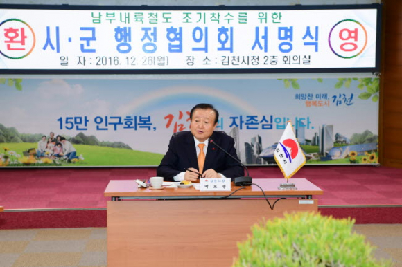 박보생 김천시장은 26일 남부내륙철도가 통과하는 해당 시․군의 자치단체장들로 구성된 『남부내륙철도 시·군 행정협의회』출범을 알리는 서명식을 개최하고, 현재 남부내륙철도사업 착수에 앞서 현재 진행 중인 예비타당성조사의 조속한 마무리를 위한 대정부 촉구성명서를 발표했다. |  | | | ⓒ GBN 경북방송 | |