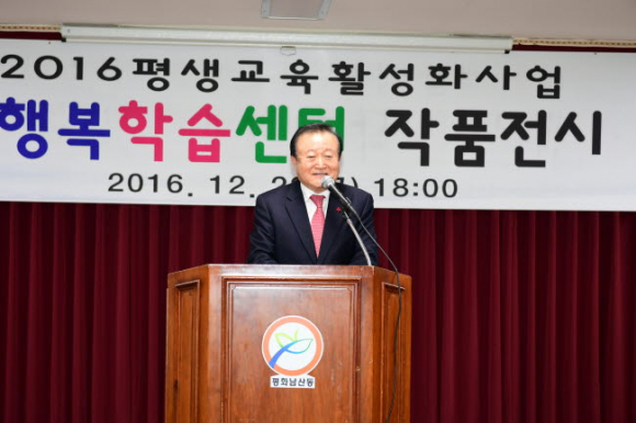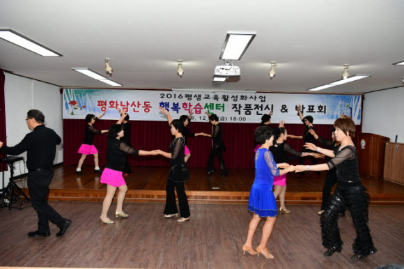 2016 평화남산동 행복학습센터 작품전시 & 발표회는 플라워클래스 및 캘리그라피반에서는 직접만든 작품을 전시하였고, 댄스스포츠(A팀, B팀), 노래교실, 코아요가팀에서는 지금까지 배운 실력을 알리는 발표회로 이어졌으며, 지역주민이 함께하는 화합의 합창으로 마무리하였다. 학습 발표는 수준 높은 공연으로 주민 모두가 하나 되는 한바탕 축제의 분위기를 만들었다.