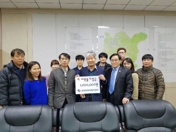 영양읍행정복지센터(읍장 이영우)는 12월 27일 올해 읍면종합평가에서 받은 시상금 100만원을 “이웃돕기성금”으로 기탁하여 훈훈한 연말분위기를 조성했다.