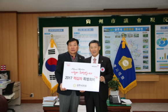 상주시의회(의장 이충후)는 이달 27일 상주시의회 의장실에서 대한적십자사 경북지사 강보영 지사장 및 관계자들을 접견하고 연말연시 불우이웃돕기 및 적십자 구호활동에 쓰여질 특별회비 1백만원을 전달하였다.