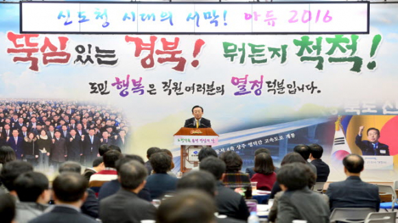 김관용 경상북도지사는 연말 송년인사에서 녹록치 않은 환경 속에서 1년여 동안 도청이전으로 업무환경과 생활의 변화 속에서도 뚜벅뚜벅 도민의 행복을 위해 헌신적으로 노력해 주었고, 늘 밝은 모습으로 도정을 함께 해 줘서 고맙다고 전했다.