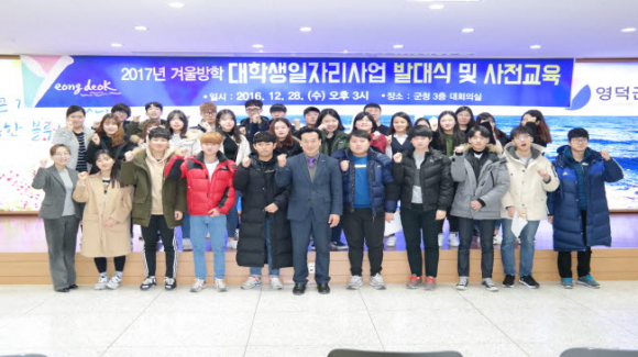 영덕군(군수 이희진)은 지난 28일 오후 3시 군청 3층 대회의실에서 ‘2017년 겨울방학 대학생일자리사업’ 발대식을 개최했다. 이번사업은 지난 23일 공개추첨을 통해 취약계층 6명을 포함한 총 42명의 대학생이 선발됐다. 다수에게 기회를 제공하고자 기 참여자의 경우 선발기준에서 후순위로 배정하여 참여를 제한하고, 공정한 선발을 위해 무작위 공개추첨방식으로 선발을 진행했다. 이날 발대식에서는 식전행사인 영덕군 홍보영상 시청과 참여자 선서문 낭독으로 참여자들의 책임감과 사명감을 고취시키고, 사업담당자의 실무교육을 통해 근무내용 안내와 안전교육을 통해 무엇보다 안전이 최우선이라는 것을 한 번 더 깨닫게 하는 시간이었다.