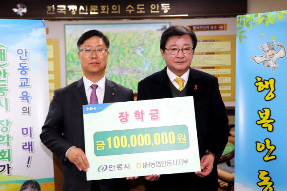 2008년 안동시장학회 설립 시점부터 매년 장학기금을 기탁해 오고 있는 NH농협 안동시지부(지부장 남재원)가 올해에도 9일 시장실에서 1억원을 기부했다. 이로써 농협은 지역의 어려운 금융 현실에서도 누적 기부액이 13억원에 이르게 되어, 시민들 사이에서는 지역민을 위한 지역은행으로서의 모범을 보이고 있다는 여론이 일고 있다.