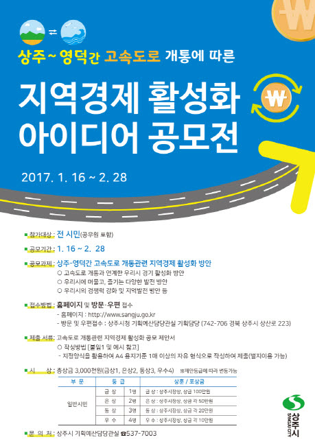 상주시는 상주-영덕간 고속도로가 개통됨에 따라 지역경제 활성화를 위해 시민들의 반짝이는 아이디어를 시정에 반영하고자 ‘지역경제 활성화 아이디어 공모전’을 실시한다.