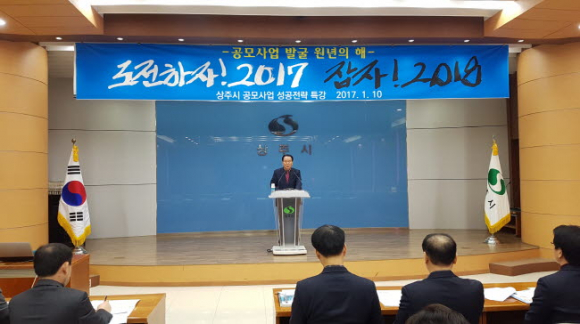 이정백 상주시장은 2017년을 ’공모사업 발굴 원년의 해’로 선포하고 새해가 시작됨과 동시에 전 공직자의 역량을 모아 중앙부처, 공공기관등을 대상으로 다양한 공모사업에 응모하여 지역경제 활성화와 고용창출을 위해 최선을 다하면서 작은 예산으로 많은 시민이 행복해질수 있는 친 서민정책에도 전 행정력을 모아 추진하겠다고 말했다. |