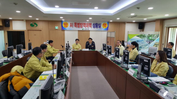 안전총괄과장은 상황보고를 하면서 상주시에서는 AI차단을 위해서 거점소독시설 3개소를 운영하고 있으며, 특히 산란계농가 5호와 메추리농가 2호에 대해서는 전담 이동통제소 7개소를 특별히 운영하며, 가금농가에는 전담공무원이 매일 예찰을 하며 100수이하 소규모 농가도 예방적 도태를 하고 있으며, 야생조류 서식지등 사육농가 주변을 철저히 소독하여 상주에는 AI가 발붙이지 못하도록 철저히 방역하겠다고 했다.