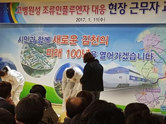 김천시(시장 박보생)에서는 전국적으로 H5N6에 의한 고병원성 조류인플루엔자로 인하여 가금류에 대한 살 처분이 대대적으로 이루어지고 있는 가운데 아직 국내에서는 인체감염 사례는 보고되지 않았지만 중국에서 종간벽을 뛰어 넘어 감염된 가축이나 오염된 분변을 통하여 인간에게도 인체감염사례가 있어, 만일 우리 관내에서 가금류에 대한 살 처분이 이루어질 경우 인체감염에 대비 및 대응하기 위하여 보건소 직원을 대상으로 인체감염대책반 운영 계획과 팀별 업무부여 및 개인보호구 착·탈의에 따른 시연 교육을 1.13(금) 보건소 3층 회의실에서 실시했다.
