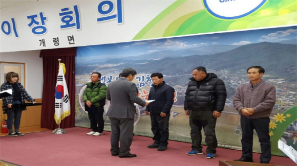 김천시 개령면(면장 김종철)은 2017년 신임 및 연임 이장에게 임명장을 수여하고 행정과 주민 간 가교역할을 당부했다.