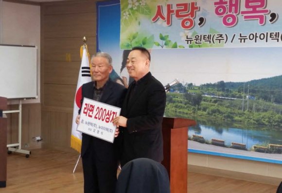 서울 송파구 소재 뉴윈텍(주), 뉴아이텍(주) 오경식 대표(남, 67)는 1월 21일 남후면사무소 회의실에서 경로당(17개소)과 사회 복지시설(2개소)에 라면 200박스와 건강보조식품 전달식을 가졌다.