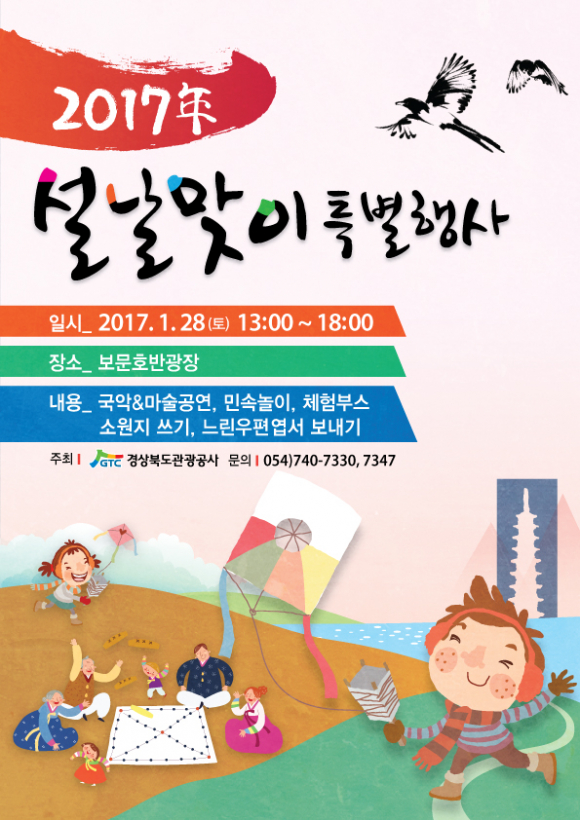 먼저 한국관광1번지인 경주에서는 경상북도관광공사(사장 김대유)가 설날인 1월 28일(토) 오후 1시부터 경주 보문관광단지 내 호반광장에서‘2017년 설날맞이 특별행사’를 개최한다. |  | | | ⓒ GBN 경북방송 | |