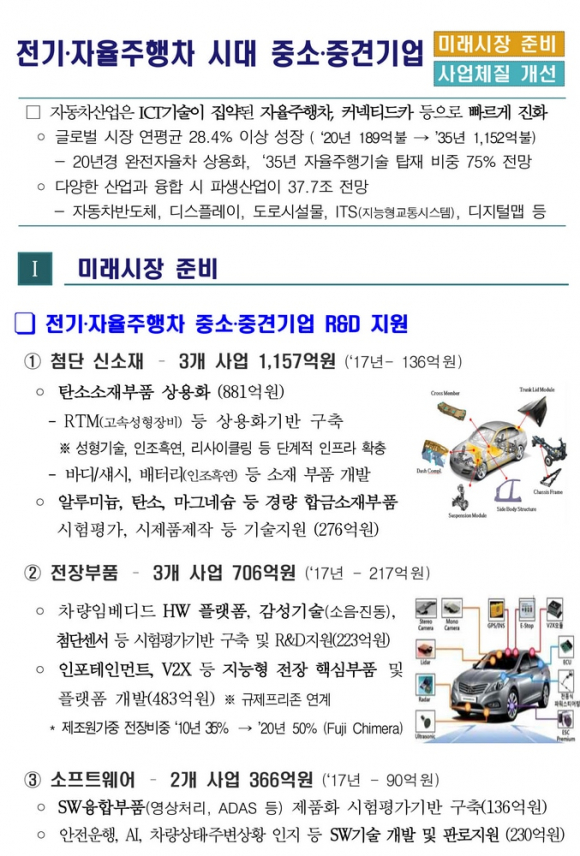 첫째, 미래형 자동차의 핵심 분야인 경량화 신소재, 전장부품, SW 중소‧중견기업의 R&D를 지원한다. 먼저, 2035년 알루미늄과 탄소복합재가 전체의 35%를 차지할 정도로 경량소재 수요가 증가함에 따라 경량소재부품산업을 집중 육성한다.