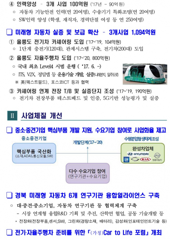 - 경량화 신소재, 전장부품, 센서, SW 등... 핵심부품 R&D 지원 강화 - - 울릉도 전기‧자율주행차 실증‧보급.. 올해 6월 최초 완전자율차 시범운행 - - 전문인력 양성, 경북형 자동차융합 얼라이언스 구축 등.. 생태계 조성 박차 -