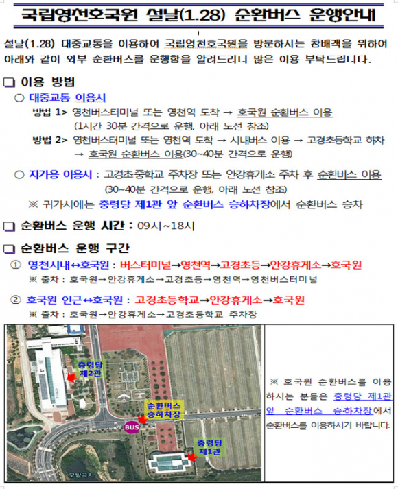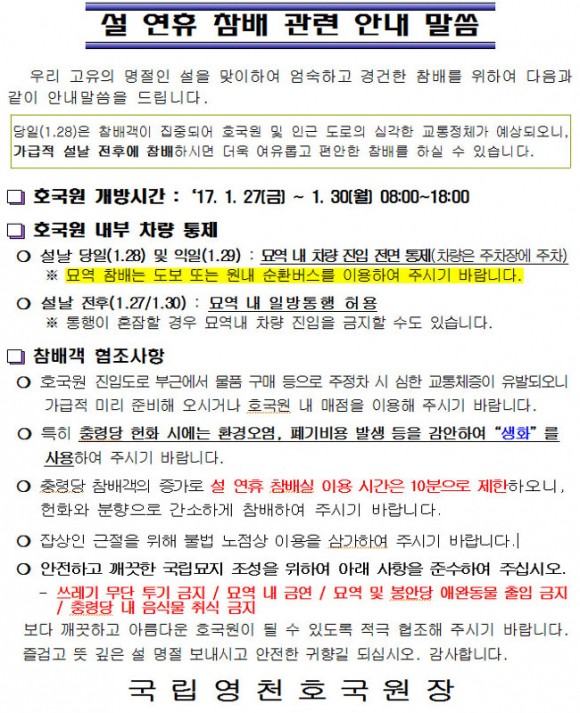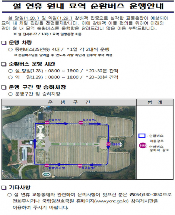 - 개방시간 변경(1.27~1.30) : 08:00~18:00 - 설날 당일(1.28), 익일(1.29) 묘역 내 차량진입 전면 통제 - 원내 묘역 및 외부 순환버스 운행