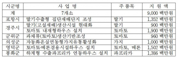 올해는 원예․특용작물 도비 공모사업으로 포항시 딸기 수출형 집단재배단지 조성, 봉화군 하계형 수출파프리카 연동하우스 설치지원 등 6개 시․군에 90억원을 투자할 계획이다.