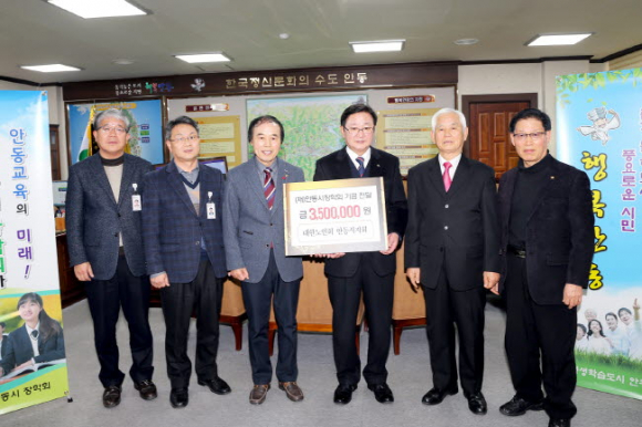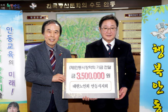 (사)대한노인회안동시지회(회장 김교환)에서는 지난 1월 31일 안동시장학회(공동이사장 권영세, 김원)에 350만 원의 장학금을 전달했다. 대한노인회안동시지회는 2010년부터 매년 장학금을 기탁해 누적금액이 1천9백여만 원에 이르고 있다.