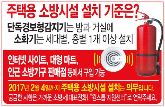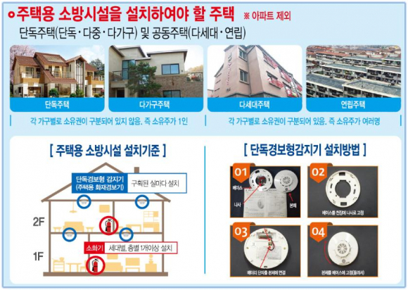 |  | | | ⓒ GBN 경북방송 | | 지난 2011년에 개정된 「소방시설법」에 따라, 신규주택은 2012년 2월 5일부터 소방시설 설치가 적용됐고, 기존주택은 2017년 2월 4일까지 주택관계자가 자진해서 의무적으로 설치하도록 규정 되어 있다. 대상은 아파트 및 기숙사를 제외한 일반주택에만 해당된다.