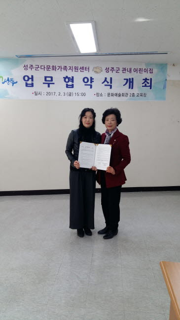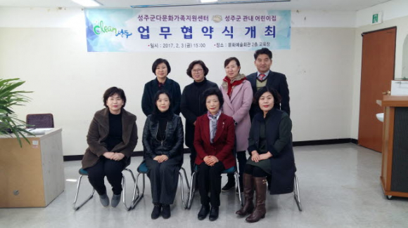 성주군(군수 김항곤) 다문화가족지원센터는 다문화가정자녀의 건강한 성장과 발달을 위하여 성주 관내 어린이집 17개 기관과 2월 3일(금) 업무협약을 체결했다.
