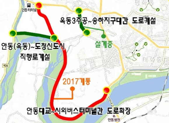 잔여 구간은 지방도 924호선과 916호선을 국가지원지방도로 승격해 국비를 지원받아 2027년까지 완공을 목표로 추진에 탄력을 가할 예정이다. 안동시 관계자는 “경북도청이 이전됨에 따라 국도 34호선이 포화상태로 교통 정체가 심화되고 있어, 새로운 진입도로인 안동(옥동)과 도청 신도시를 10분 이내로 연결할 직행로를 개설하게 되면, 안동시와 도청 신도시간 활발한 교류는 물론 원활한 교통환경 제공으로, 물류와 관광수요가 급증할 것으로 예상되어, 활기차고 발전하는 도시로 거듭날 것은 물론 경북도청 이전 효과 극대화의 특수를 누릴 것으로 기대한다.”고 말했다. |