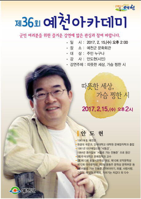 예천군에서는 오는 15일 오후 2시 예천군문화회관에서 군민 및 공무원들을 대상으로 예천출신 안도현 시인(우석대 교수)을 모시고 제36회 예천아카데미가 열린다.
