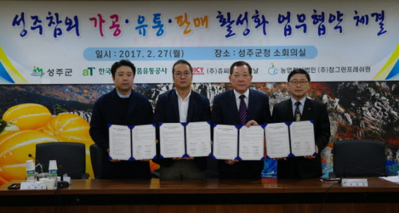 성주군(군수 김항곤)에서는 성주참외 가공산업화를 위하여 aT, ㈜쥬씨인터내셔날 등 관련기관 및 업체와 2. 27(월) 성주군청에서 20여명이 참석, 업무협약을 체결했다.