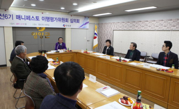 영양군(군수 권영택)은 2017년 3월 6일(월) 14시 군청 소회의실에서 매니페스토 위원 8명이 참석한 가운데 민선6기(‘14.7.~현재) 동안 추진해 온 공약사업에 대하여 이행평가를 시행했다.