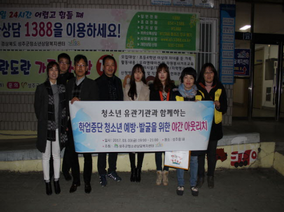경상북도 성주군청소년상담복지센터(센터장 오익창)는 지난 3일 위기청소년 사회안전망(CYS-Net)의 필수연계기관인 성주경찰서, 성주교육지원청과 연합하여 오후7시부터 성주읍 일대 학교, 터미널, PC방, 오락실, 음식점, 편의점, 청소년 배달업소 등을 돌며 학업중단 청소년 예방 및 발굴을 위한 야간 아웃리치(outreach)활동을 전개했다.