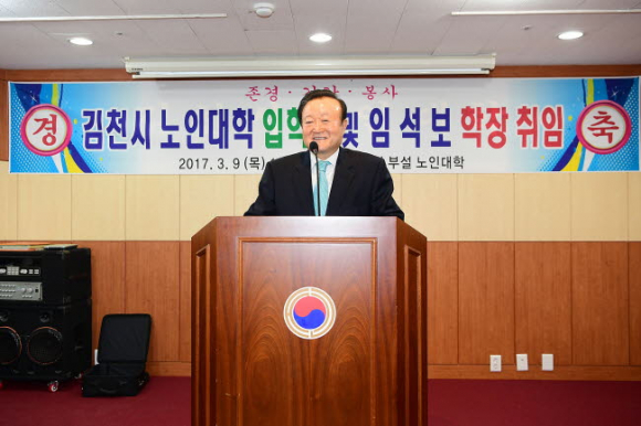 이날 입학식에는 지난 2월28일 제5대 김천시 노인대학장으로 선출된 임석보 학장의 취임식을 겸해 진행되었으며, 김영해 대한노인회 김천시지회장 및 회장단, 박보생 김천시시장, 김응규 경북도의회 의장, 배낙호 김천시의회 의장이 참석한 가운데 개최됐다.