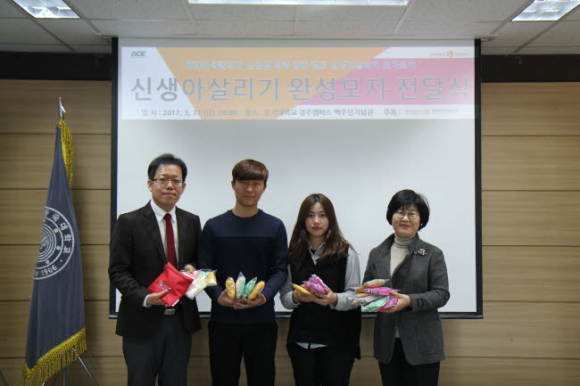 이번 전달식은 지난 1월 동국대 경주캠퍼스 2017년 신입생 역량 강화 캠프 중 인성교육의 일환으로 진행된 ‘신생아 살리기 모자뜨기 캠페인’에 참가한 학생들이 완성한 모자를 세이브 더 칠드런에 전달하기 위해 개최됐다.